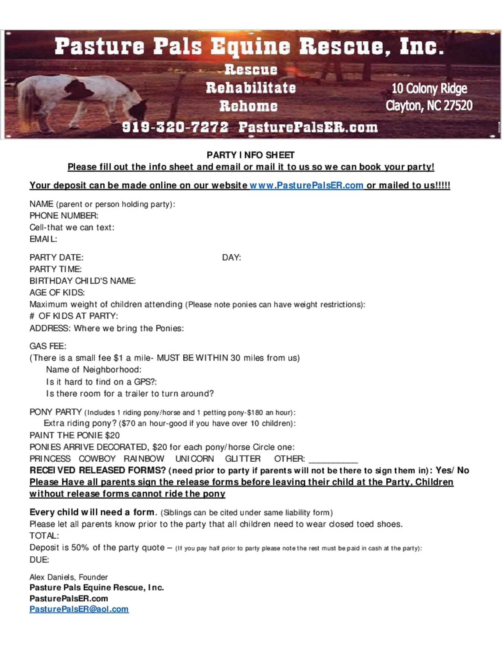 If you're interested, please read our party rules here, and then make sure to fill out our party form and mail or email it to pasturepalser@aol.com